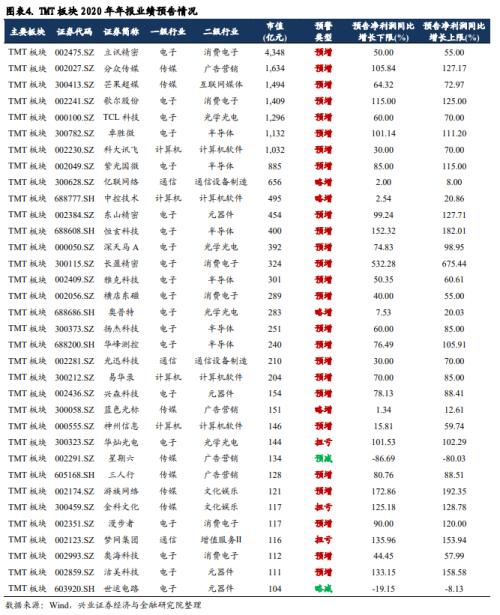 4.TMT板块(传媒7家、电子20家、计算机4家、通信3家),TMT板块总共34只,业绩预计增长的达到27家,占比达到79.4%。①传媒板块视频和广告的龙头公司芒果超煤、分众传媒(行情002027,诊股)业绩预计70%、100%左右。②半导体链条IC设计业绩100%左右,材料、器件等增长50%-60%,设备端增速80%-100%。③面板、PCB、消费电子等业绩均出现明显好转,优质公司增速不错的现象。