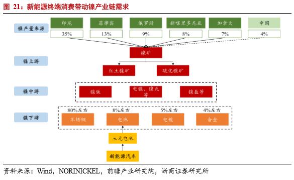 镍及其产业链的需求将受新能源电池的普及推动。中国镍下游需求分布中,新能源相关的行业为电池行业,占比为8%,主要来源于新能源汽车产业链中的三元电池对硫酸镍的需求,预计未来随着新能源汽车的普及和快速发展,镍的下游需求中电池消费占比将会大幅提升,带动镍的需求大幅增强。
